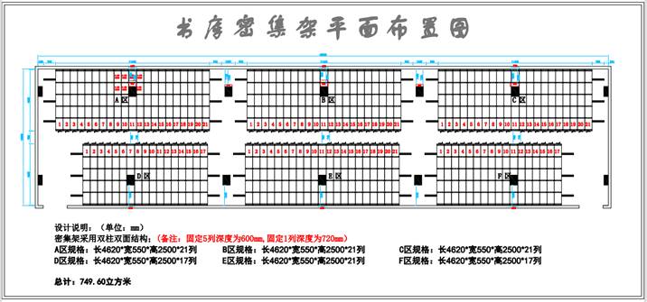 根據(jù)客戶前期提出的幾個要求,我司設計部與客戶溝通好后,根據(jù)書庫房間結構結合客戶的需求設計了118列密集架,因房間柱子較多分6個團體。